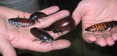 The roaches above are harmless pets, never found in the location mentioned in the article. I hope. (Thanks to the crew at Twin Cities Reptiles for this photo op.)