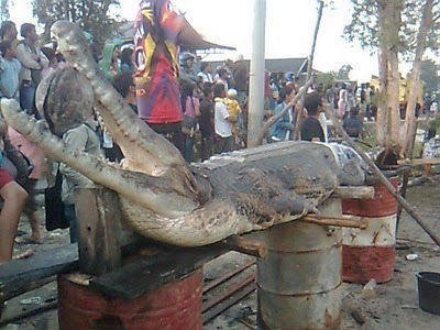 In Malyasia, a man was killed by a false gharial. Although all crocodilians are potentially dangerous, this species has not previously been known to kill people. It specializes in fish. The bottom photo shows that it has a long, slender snout adapted for that purpose. Its legs are also small for a crocodilian; that's because it spends a lot of time in the water even by croc standards and doesn't need to get around on land.