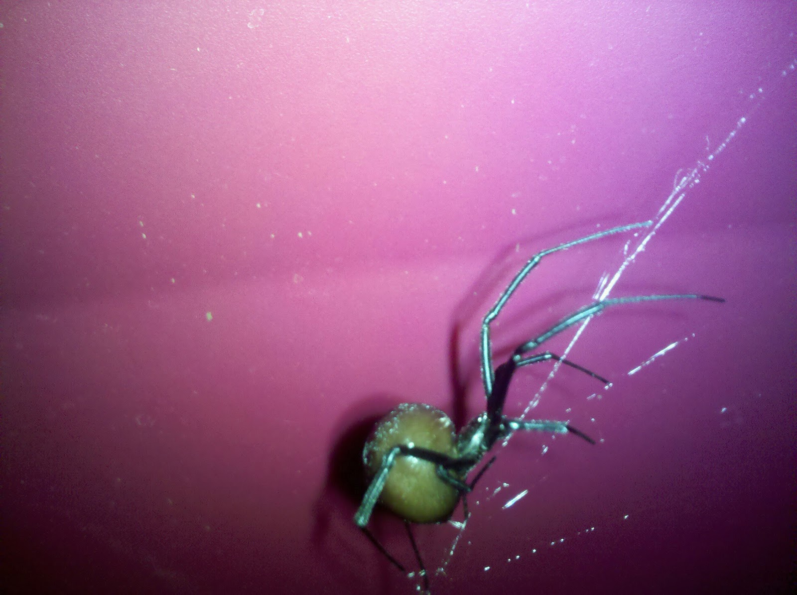 Mike also sent me these images of the black widow in his garage. The purple plastic storage container in the background makes the widow look almost green.