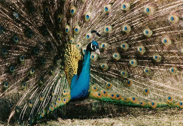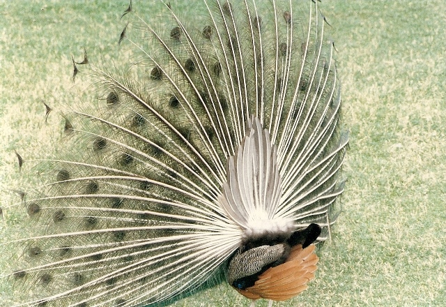 A peacock, startled from the back premises of the Hall, came flapping up the terraces to the churchyard. The peacock flapped beyond me, on to the neck of an old bowed angel, rough and dark, an angel which had long ceased sorrowing. The bird bent its voluptuous neck and peered about. Then it lifted up its head and yelled. The sound tore the dark sanctuary of twilight. The old grey grass seemed to stir, and I could fancy the smothered primroses and violets beneath it waking and gasping for fear. Again the bird lifted its crested head and gave a cry, at the same time turning awkwardly on its ugly legs, so that it showed us the full wealth of its tail glimmering like a stream of coloured stars over the sunken face of the angel.