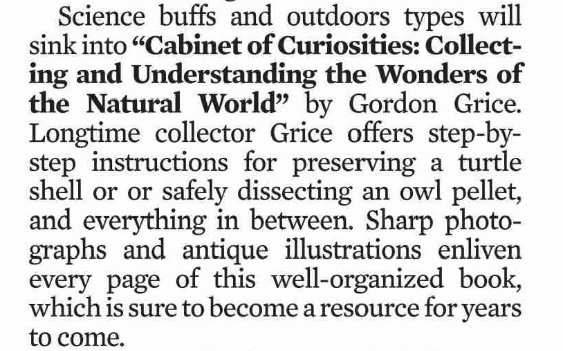 ‘The Big Book of Animals of the World,’ and More - The New York Times: "Gordon Grice began collecting at age 6, filling a cigar box with such natural-world discoveries as a skunk’s skull, porcupine quills and seed pods, and he has never stopped. In “Cabinet of Curiosities,” he gives an engaging historical overview of the human enthusiasm for collecting. . ."