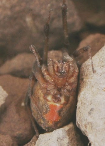 Hourglass marking on the belly of a brown widow (Latrodectus geometricus)Max sent me this news article about a widow spider eating a snake in someone's office. The spider is a brown button, a common name that covers the critter known in the US as the brown widow as well as a closely related species. Folklore has it that the brownie is far deadlier than the blacker species of widow and occasionally takes a human baby. None of that is true, but it makes for some nice internet freak-outs.