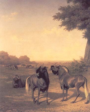 I saw a herd of wildebeeste, and with much care managed to get within three hundred yards of them. I singled out the biggest head and waiting for a favourable moment, fired at him, dropping him at once. I ran up to the fallen beast, which appeared to be dying, and told Mahina to drive the hunting knife right through his heart so as to put him quickly out of all pain. As Mahina was not doing this as skilfully or as quickly as I thought it might be done, and seemed unable to pierce the tough hide, I handed him my rifle and took the knife in order to do it myself. Just as I raised the knife to strike, I was startled by the wildebeeste suddenly jumping to his feet. For a moment he stood looking at me in a dazed and tottery kind of way, and then to my amazement he turned and made off. At first he moved with such a shaky and uncertain gait that I felt confident that he could only go a few yards before dropping; so, as I did not wish to disturb the other game around us by firing a second shot, I thought it best just to wait. To my utter astonishment, however, after he had staggered for about sixty yards he seemed to revive suddenly, broke into his ordinary gallop and quickly rejoined the herd. From that time I lost all trace of him, though I followed up for four or five miles.