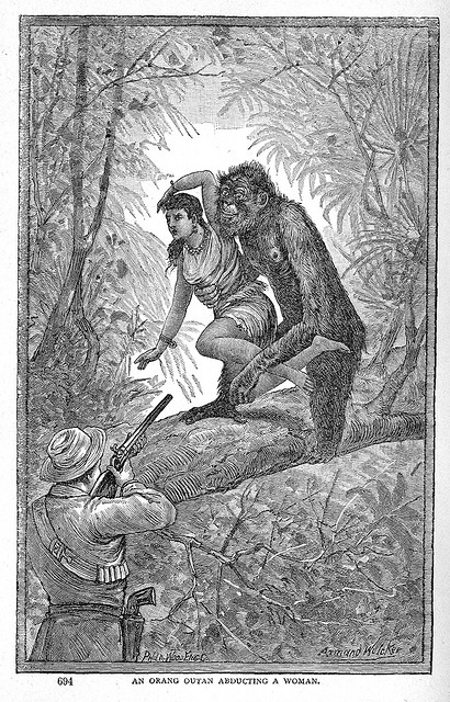 We were talking a while back about apes taking a sexual interest in humans (see the comments following that linked post). As seen in the illustration above, this was a favorite notion of the Victorians. But, as detailed in the comments of this earlier post, there are a few cases of orangutans and other apes taking a sexual interest in humans.