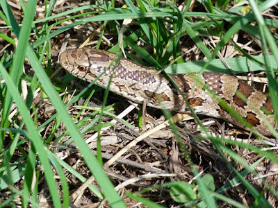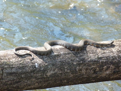 "The fellow on the log is a Northern Water Snake. He was probably about 4 ft long or so. I recently read up on these guys, since I encounter them on a rather frequent basis. According to what I have read, they are not classified as venomous, but they do inject a small amount of anti-coagulant venom when they bite. They are also quite aggressive in defending themselves if they feel threatened. I have another set of photos that support that theory coming next."