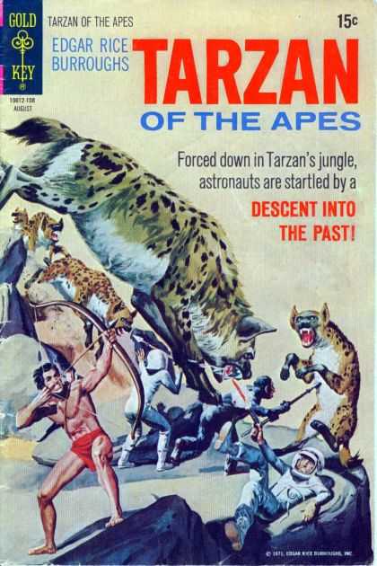 A couple of scans from the Tarzan comic book I mentioned last week. Borrowing an idea from Arthur Conan Doyle, creator Russ Manning has his protagonists on a plateau that time forgot, populated by prehistoric mammals: giant warthogs, a saber-toothed cat, a megatherium. The hyaenadons, as conceived by Manning, look and behave a lot like modern spotted hyenas. Hyaenodons were real, though they are now classed as creodonts, primitive carnivores not closely related to hyenas.
