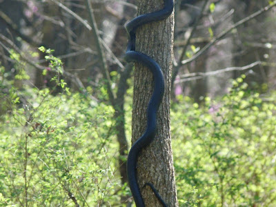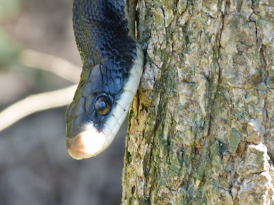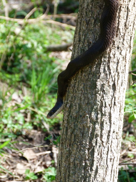 "The Rat Snake was a beauty, at least 6 feet (probably more along the lines of 7 or so if she had not been clinging to that tree for dear life) and freshly shed and so shiny I wanted to touch her. She was very observant of me, but she did not show any defensive posturing and I was able to get within 4 foot or so of her. As soon as I walked away, she turned and made her way back up to the top of the tree."