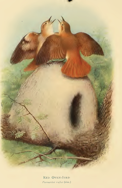 A very curious thing occurred at the estancia house of a neighbour of mine in Buenos Ayres one spring. A pair of Oven-birds built their oven on a beam-end projecting from the wall of a rancho. One morning one of the birds was found caught in a steel trap placed the evening before for rats, and both of its legs were crushed above the knee. On being liberated it flew up to and entered the oven, where it bled to death, no doubt, for it did not come out again. Its mate remained two days, calling incessantly, but there were no other birds of its kind in the place, and it eventually disappeared. Three days later it returned with a new mate, and immediately the two birds began carrying pellets of mud to the oven, with which they plastered up the entrance. Afterwards they built a second oven, using the sepulchre of the dead bird for its foundation, and here they reared their young.
