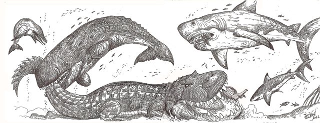 They probably gave birth to live young, like many other sea reptiles of the time. Free from the need of returning to land, they spent their lives in open waters. Many, like Metriorhynchus, had long, slender snouts that would resemble some living crocodilians, like the gharial; they were superbly adapted to capture fish. Usually, they measured about three meters long-- smallish compared to our largest crocodiles-- but they were far better swimmers.