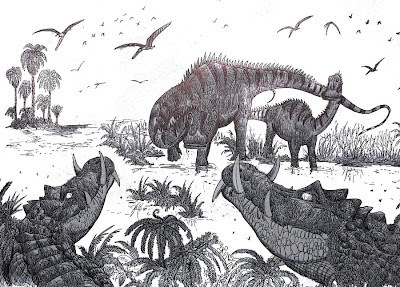 Kaprosuchus sizing up their preyMost books tell us that dinosaurs dominated the world with an iron claw during 160 million years or so. They were so big, so fierce and so powerful that all other animals had to flee from them (becoming flyers, like pterosaurs, or aquatic like crocodiles) or become so small and insignificant that dinosaurs wouldn´t even pay any attention to them (like mammals).