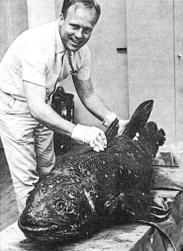 In 1938, a coelacanth was brought up from the depths near South Africa. That was a startling development because scientists were aware of the coelacanth only from the fossil record and assumed it had been extinct since the days of the T. rex. It’s an interesting fish because, as the characters in the movie mention, it’s more closely related to four-footed land animals than other fish are.