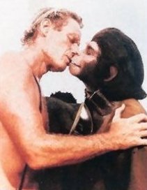 After a rash of similarly sinister appearances, the ape began to evolve into a more sympathetic figure. King Kong, the most successful popcultural representation of the ape to date, impresses many viewers as a simple-yet-noble schmoe tragically whipped by technology. Of course, he can also be seen as a big black guy who digs white chicks—a view which probably accounts for some of the film's impact on the America of the 1930s. By the 1960s, Planet of the Apes had turned our first cousins into an ironic lens for looking in a more intellectual way at ourselves. That peculiar sensation crystallizes in a scene near the end of the film: a chimpanzee tells our human hero he's almost too ugly to kiss.