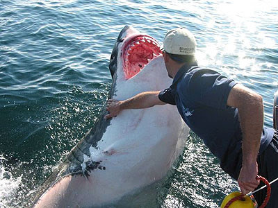 This last one shows a biologist petting a great white shark as it leaps from the water.