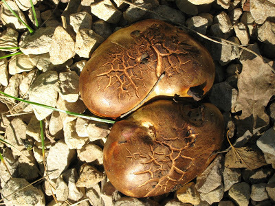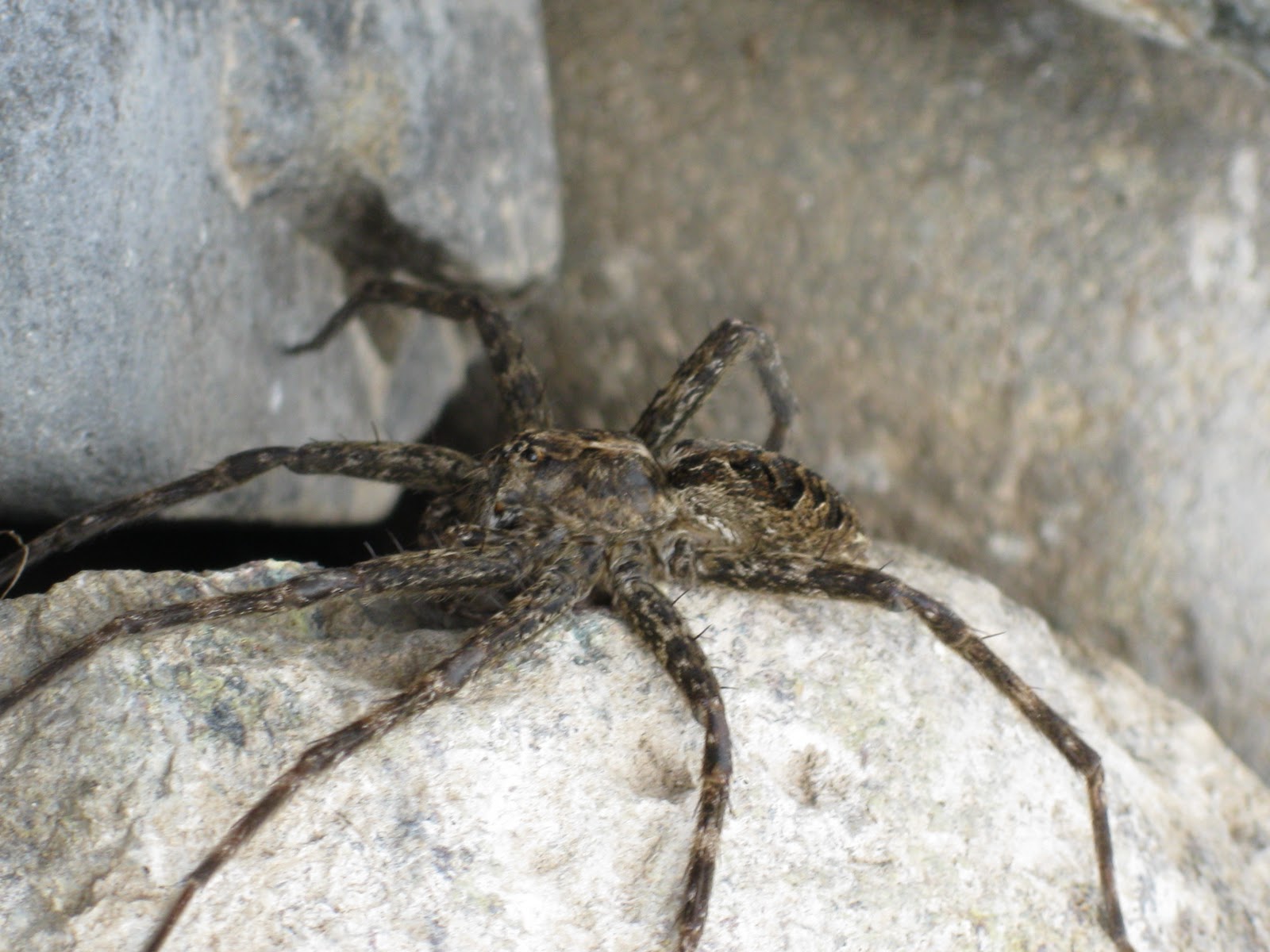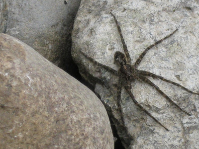 The biggest kind of spider in my Wisconsin woods is the fishing spider. This one had a leg span of about four inches. Fishing spiders dive for their prey, breathing the air trapped in bubbles among their hairs. They can take small fish and tadpoles.