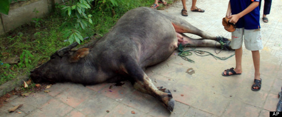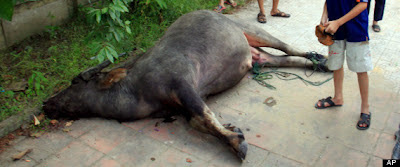 Hue City, Vietnam Buffalo Rampage Injures 10 People: "A water buffalo injured 10 people in central Vietnam while rampaging down crowded streets, across a river and through a house before being gunned down at a kindergarten, an official said Monday.