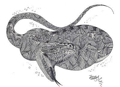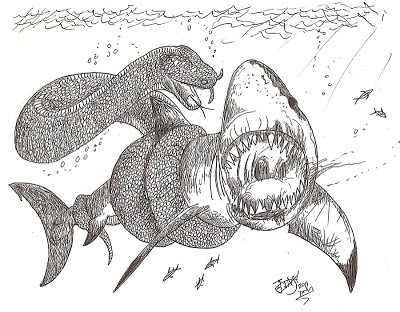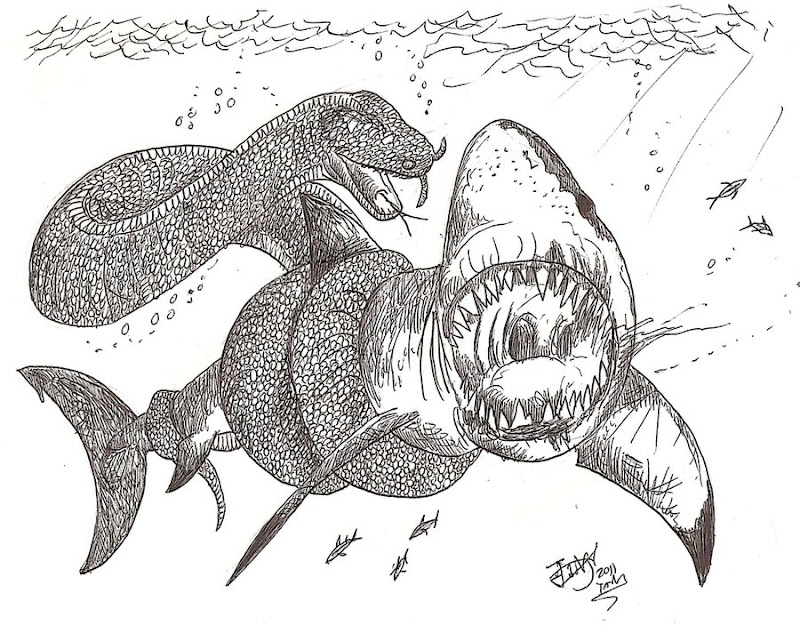 Paleophis vs. Otodus, an ancient shark related to the great whiteOne of them, Palaeophis, could grow up to 9 meters long, and was probably a denizen of estuaries and coastal waters. A close relative of it, Pterosphenus, was even better adapted to a marine lifestyle, with a laterally flattened tail just like modern day sea snakes. But unlike our venomous sea snakes, related to cobras and kraits, Pterosphenus was probably a non-venomous fish eater, measuring up to 7 meters long-- over three times larger than the largest modern day sea snakes. Unfortunately, there’s no way to know if this giant could obtain part of its oxygen directly from the water, like some modern day sea snakes do.