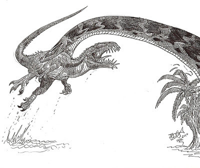 This makes Gigantophis as big as the biggest reported reticulated pythons, and certainly much bigger than any confirmed giant python in modern times. What this giant snake ate is still a mystery. The remains of primitive, pig-sized elephants and other creatures have been found in the same fossil sites, but if Gigantophis was unable to unhinge its jaws like a python, these creatures may have been too much to handle. It is possible that it was a fish eater, though; back then, the region of Egypt where it lived was not a desert, but a coastal swamp. It is possible that Gigantophis spent a lot of time in the water, like modern day anacondas. Alternatively, it may have preyed on water birds or perhaps on other, smaller reptiles. At about the same time, the sea was home to other giant serpents.
