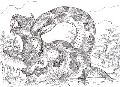 Titanoboa takes a Coryphodont, a primitive mammalUnfortunately, Australia’s awesome giant tree python was overshadowed by a 2009 discovery; in a coal mine in Colombia, the remains of a snake even bigger than either Gigantophis or Liasis dubudingala were found, and quickly became headlines around the world. Compared to the equivalent bones in a modern day anaconda, those of the Colombian snake were humongous; scientists estimated that, when alive-- 60 million years ago-- this snake was probably between 13 and 15 meters long, being, they said, “the largest snake ever to have existed.” They named the creature Titanoboa, for it was not a python, nor a madtsoiid, but a member of the Boidae family, the same family that includes modern day boa constrictors and anacondas. The implications of this can send shivers down one’s spine; this was a giant snake that could unhinge its jaws and swallow enormous animals. The coal mine even provided a glimpse to the possible menu of Titanoboa; enormous freshwater turtles and crocodiles, suggesting that Titanoboa was probably a water based animal.