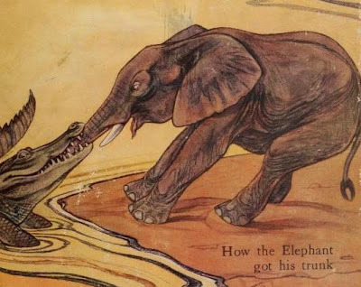 Then the Elephant's Child sat back on his little haunches, and pulled, and pulled, and pulled, and his nose began to stretch. And the Crocodile floundered into the water, making it all creamy with great sweeps of his tail, and he pulled, and pulled, and pulled.