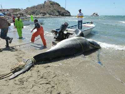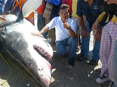 Fishermen based in Guaymas, Sonora, Mexico, brought in this massive great white shark. It was already dead when they encountered it; apparently it died after becoming entangled in the nets they had set for flounder.