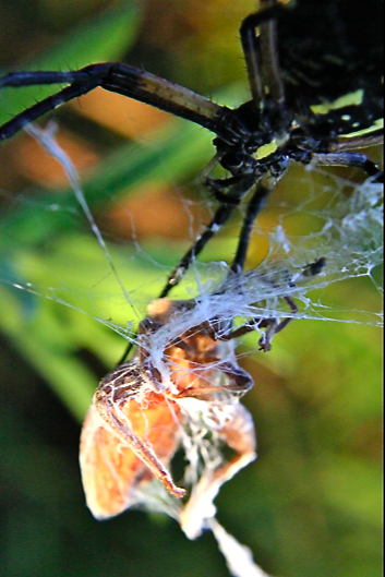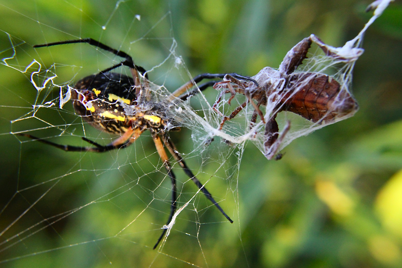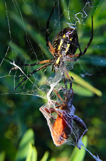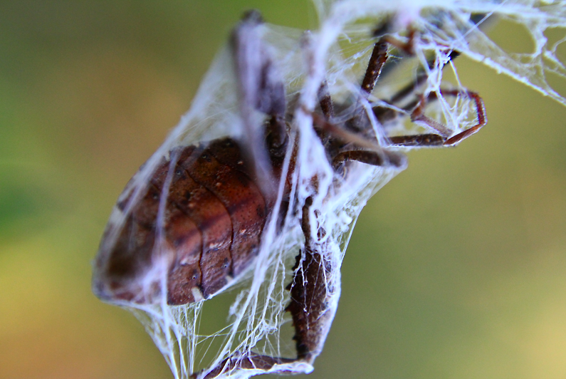 The assassin bug, itself a formidable predator, usually succeeds in defending itself with its repugnant scent. Here, it falls victim to an orb-weaving Argiope spider.