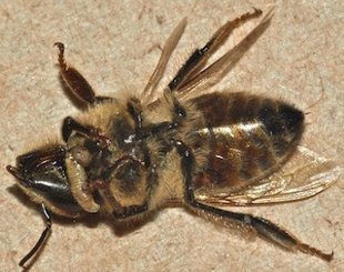 A maggot emerges from the body of a dead bee (between the head and the thorax)Bee hives have been dying in droves the last few years. So far, scientists have suggested viruses, fungi, and mites as causes. A new discovery shows that parasitic flies have infected many hives in California. The flies somehow insert their eggs into the bee; the maggots that hatch from the eggs take over the bee's body, consuming it and leading it to self-destructive behavior.