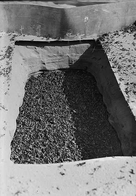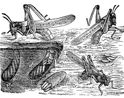 Rocky Mountain locusts laying eggs in topsoilMuch of the grasshopper's insides are taken up byreproductive equipment. The female's ovaries produce rows and rows of eggs,which are attached by stemlike parts to each other. The effect is somethinglike an orderly bunch of grapes, lined up mostly in neat rows, and glisteningwith moisture. However, the naked eye is impressed mainly by the fat blackstrand of digestive tract. Narrower in spots and girdled with knotty, fibrous projectionsnear the middle, it is essentially a tube. The dark color is that of chewedvegetation. At any given time, a substantial proportion of the grasshopper'sbody weight is its unconverted food. When a grasshopper is eaten by a mantis,the mantis typically eats around this unattractive vegetation. It is leftholding the digestive tract, which resembles the stick at the center of a corndog.