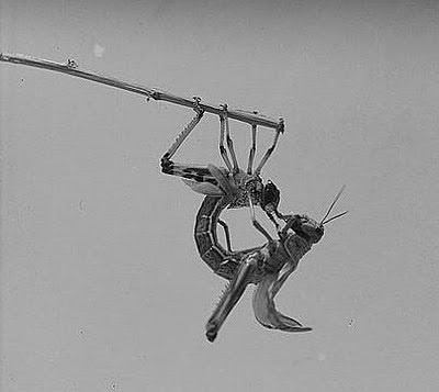 The jars didn't suit them: They were heavy, humid creatures,and in a day or two the glass was fogged with condensation, the bottom of thejar laden with their conical black feces and their spit. They died off quickly,even when placed in more commodious accommodations. I tossed a grasshopper intothe web of a black widow spider, assuming the spider would dispatch it quickly.Instead, the grasshopper's energetic struggles wrenched it loose from the web,though at the cost of a hind leg. I repeated this experiment with a differentindividual. This time the grasshopper's leaps freed it easily, and furtherleaping knocked the spider from its web. The spider lay on its back, kickingfrantically, as the grasshopper chewed its front leg.