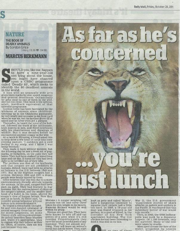 Good news from Great Britain: The Book of Deadly Animals is the subject of a full-page rave review in the Daily Mail, the nation's largest non-tabloid newspaper. "This review can barely scratch the surface of its wonder," says reviewer Marcus Berkmann.