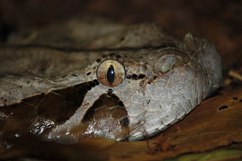 Gaboon Viper (Ltshears/Creative Commons)There was no antivenom available at the time, and so theyhad to chop the man's hand with an axe to prevent the venom from spreading to hisbody. He lived, but his story was scary enough for me to think twice about mywild dream. After all, as much as I loved animals, I loved drawing and writingjust as much, and I needed my hands and fingers intact to do that.