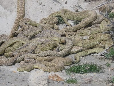 Thanks to Amanda, who forwarded me this set of photos featuring the denning behavior of rattlesnakes. Forwards are of course not always to be trusted, but this one claims the dens are in the area of Fort Smith, Arkansas. Rattlesnakes congregate for the winter, sometimes by the thousands. These look to me like prairie rattlers, the kind I mostly grew up with in Oklahoma. For more about rattlesnake denning, see The Red Hourglass.