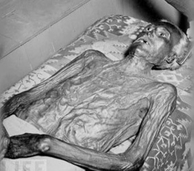 A century ago the furniture store was a hotel, and on the second floor its honeycomb of tiny rooms is mostly intact, and mostly crammed with excess inventory. He takes me into the Death Room, the walls of which are covered with tatters of turn-of-the-century wallpaper. In this narrow cell--maybe six feet wide, with walls reaching far short of the ceiling--the furniture is a century old, but set up as if for living--an iron bedstead with a thin mattress, a wash stand and basin, a table and hard-backed chair.