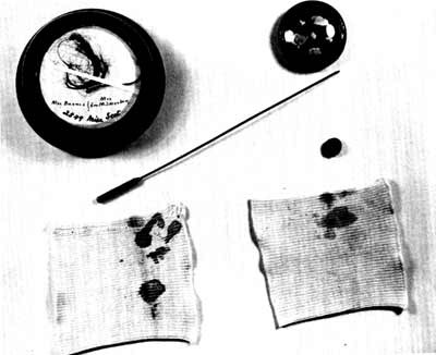 The wounds in the occipital bone was quite smooth, circular in shape, with beveled edges. The opening through the internal table being larger than that through the external table. The track of the ball was full of clotted blood and contained several little fragments of bone with a small piece of the ball near its external orifice. The brain around the track was pultaceous and livid from capillary hemorrhage into its substance. The ventricles of the brain were full of clotted blood. A thick clot beneath the dura mater coated the right cerebral lobe.