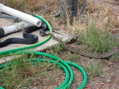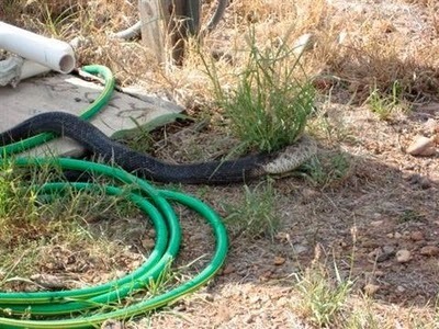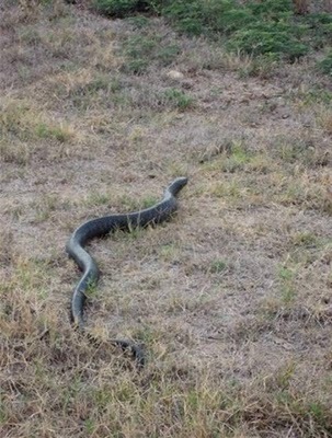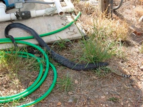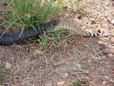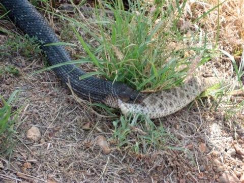 I received this interesting series of pictures in an email forward. The email identifies the predator as a black snake, though I find claims on the web that it is actually an indigo. The victim is a Western diamondback rattlesnake.