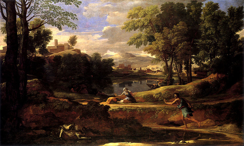 Mark Dery pointed me to this painting by the 17th Century French artist Nicolas Poussin. Hard to see just what the snake in the foreground is doing here, but thankfully we have the title to help us: Landscape with a Man Killed by a Snake. (The link will take you to the National Gallery's website, which offers a little background.) I've never seen a Poussin painting in person, but to judge by what I see online, the guy has serious problems matching tone with material. Over on Art Renewal, for example, I see a lovely painting of a fellow getting disemboweled, and a delicately colored view of a guy stomping on a baby. I'm finding this snake one inappropriately beautiful as well.