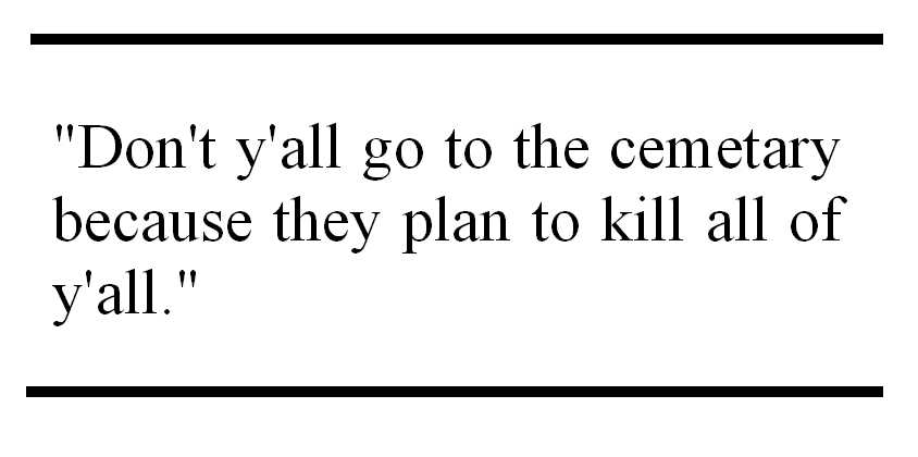 I asked my cousin what happened afterwards as all we see in the lynching annals is that Uncle Clax was lynched for murder on December 15. She told me, “From my understanding Clax killed that man—might a killed two or three others—he got away and went home.” When uncle Clax returned to the farm and told what had happened, a mob had formed. They took him and lynched him (with no rights to a trial) as that was the typical punishment for killing a white person (justified or not) during the day. As he hung, the enraged mob riddled his body with bullets. I asked my cousin what happened afterwards and she clasped her hands and held her head down, “They told me they drug him through Metter [for all to see]. . . . After they drug him for so long, it was one white man that told them [the mob] if they didn’t untie that man from that [buggy] and give him back to his people—because he was already dead—that he would start shooting. So they finally untied him and gave him to his people. . . . While they were having the funeral, those white people went to the grave and they meant to kill the whole family. They were hidden in the woods. And this other white man that made them untie [Clax] went to the church and told [the family], ‘Don’t y’all go to the cemetery because they plan to kill all of y’all.’”