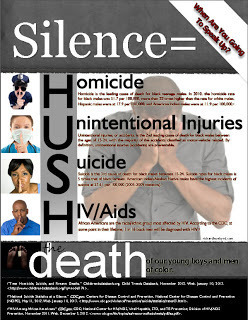 Homicide, Unintentional Injuries (accidents), Suicide, and HIV/Aids (HUSH) can be prevented; however, they continue to plague young men of color. What’s the answer? AWARENESS and SPEAKING OUT is a beginning. Don’t continue the “HUSH” cycle; break the silence by spreading the word and voicing your concern.