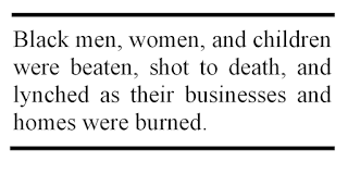 History reminds us that there were riots (unlike those in Ferguson and Baltimore) that destroyed many communities and thousands of lives; communities and lives destroyed not by the citizens within them, but from those outside. And growing up in Tulsa, Oklahoma, I was constantly reminded about the RaceRiot of 1921 (and the many others). A race riot where men, women and children were burned and hunted down in the streets; where stores and businesses were burned and looted; where a once bustling, thriving community—known as Black Wall Street—was literally, fire bombed and demolished.