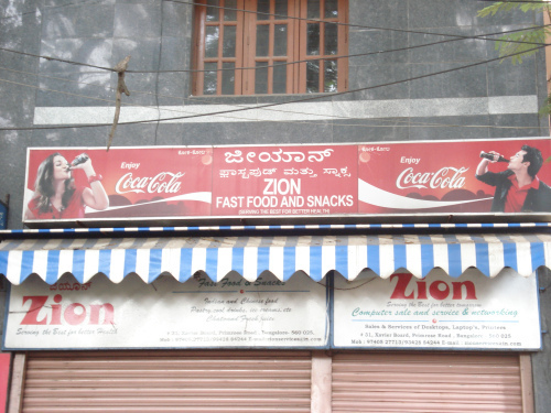 In Bangalore one can see this in the expected way with names like John or Mary. But what is unexpected are the names associated with Palestine like Nazareth and Hebron. But the more I wandered around, the more I saw that did not seem to be related to Palestine per se, but rather to the specific American brand of Christian Zionism that often comes with various brands of evangelical Christianity. One can see this, too, in everything from the names of churches to signs on ordinary businesses. When I Googled Bangalore and Zion, I found a number of businesses that turned up from IT companies to money changers to hospitals and clinics.
