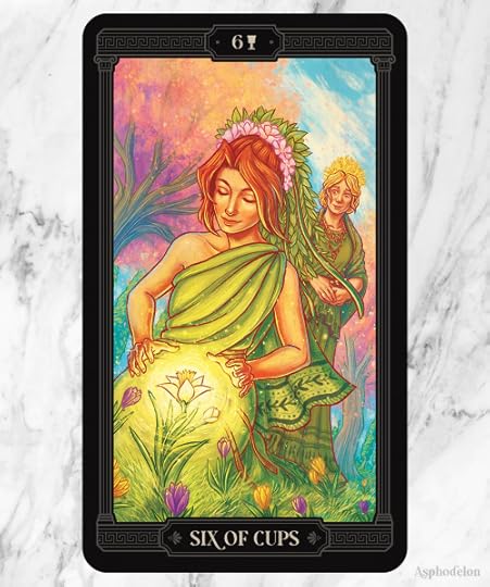 SIX OF CUPS 🌸 PERSEPHONE’S RETURNThis one was designed to call back to The Fool. :) Each suit has one card that depicts additional scenes from Persephone’s story.