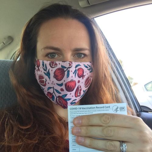 Here I am in my pomegranate mask. One and done and I am so, so relieved right now (R couldn’t get his yet, so we’ll be back here in a week or two) #covidvacccine💉 #pomegranate (at Oakland–Alameda County Coliseum)
