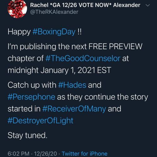 Happy #BoxingDay !! I’m publishing the next FREE PREVIEW chapter of #TheGoodCounselor at midnight on January 1, 2021 EST Catch up with #hades and #persephone as they continue the story started in #ReceiverOfMany and #DestroyerOfLight Stay tuned.