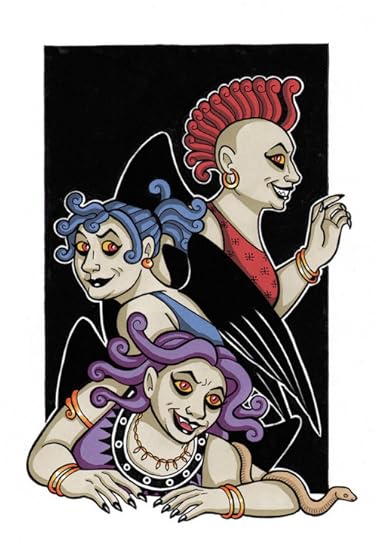 “Athena herself says they look unlike “any kind of thing that is begotten,” whether god or mortal. They lack, in particular, the normal signs of femininity. They have dark skin, which is typically a feature of male masks, in contrast to the lighter complexion associated with women. They may also be wearing short outfits suitable to their role as hunters, which would, again, mark them as “masculine”. Though virginal, they lack the charm of the parthenos. They are described paradoxically as “aged girls”, “ancient children”, and “children who are not children”. This repeated use of oxymoron vividly conveys the Furies’ asexual nature. They embody childhood and old age at once, without the eroticism of the bride or the fertility of the mature woman that should lie between.”