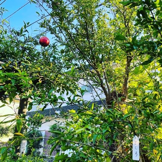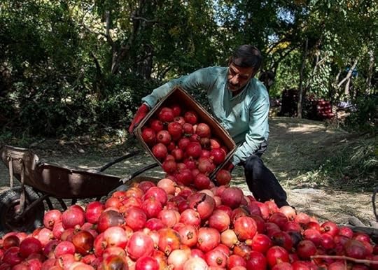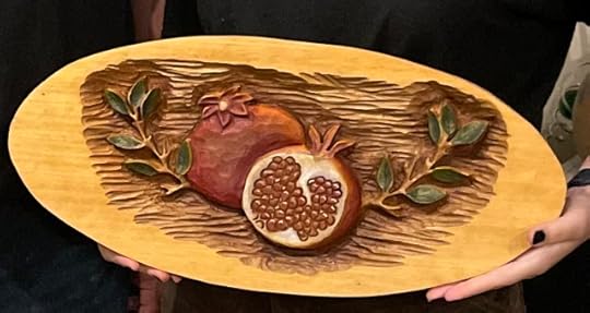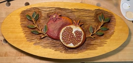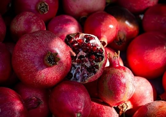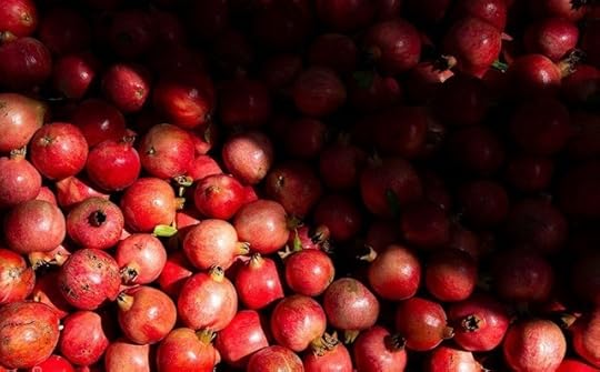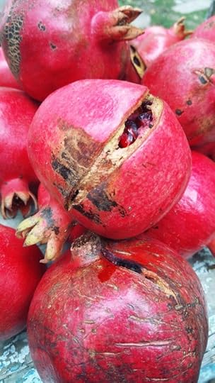 [Image description: a tessellation, or repeating pattern of interlocking shapes, of skulls, anatomical hearts, and pomegranates. The shapes are painted in watercolors and outlined in black pen, and are all drawn in a sort of simplified, angular style. /end ID]