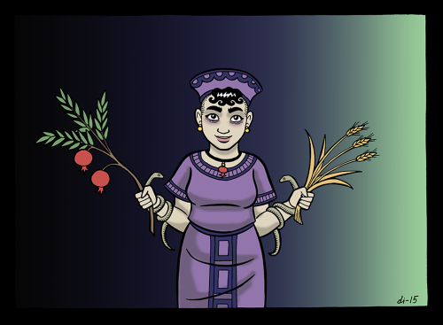 I have always had some problems to draw Persephone as a queen. For some reason I like her better dressed as a simple peasant girl soiled with earth. But now I think I’ve nailed it. This feels like her (my interpretation of her, that is). Quite simple but yet elegant.