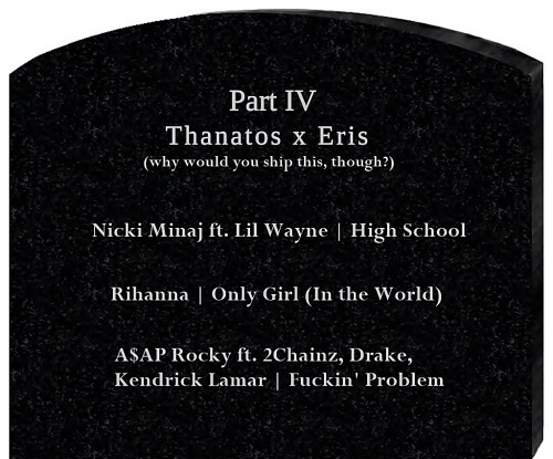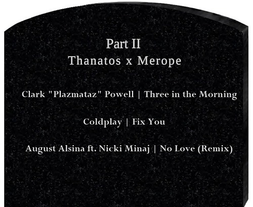 Tracks: Drake ft. Lykke Li - Little Bit // Maroon 5 - Misery // Secondhand Serenade - Fall for You // Rihanna ft. NeYo - Hate That I Love You // Clark “Plazmataz” Powell - Three in the Morning // Coldplay - Fix You // August Alsina ft. Nicki Minaj - No Love (Remix) // Ariana Grande ft. The Weeknd - Love Me Harder // Dead Man’s Bones - Lose Your Soul // Evanescence - My Immortal // Nicki Minaj ft. Lil Wayne - High School // Rihanna - Only Girl (In the World) // A$AP Rocky ft. 2Chainz, Drake, Kendrick Lamar - Fuckin’ Problem // The Radio Dept. - Too Soon