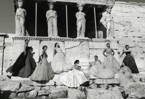 Christian Dior models under the Caryatids of the Erechtheion temple on the north side of the Acropolis in Athens,Greece.(1951).