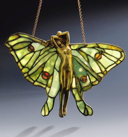 Rare figural lamp screen. Created by Tiffany Studios, c.1905.Leaded glass, gilt bronze