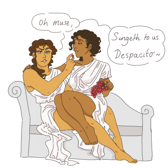 Sappho, lounging on a couch with her girlfriend on her lap, popping grapes into her mouth: Oh muse, singeth to us Despacito.