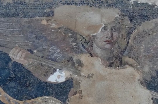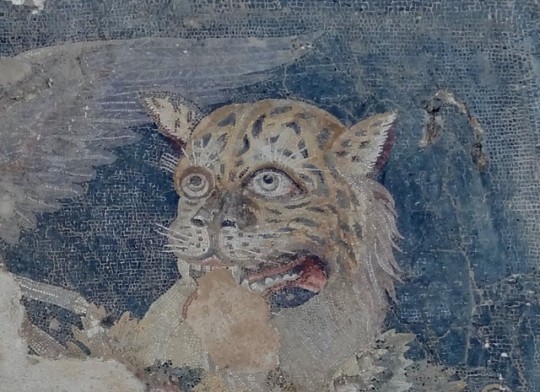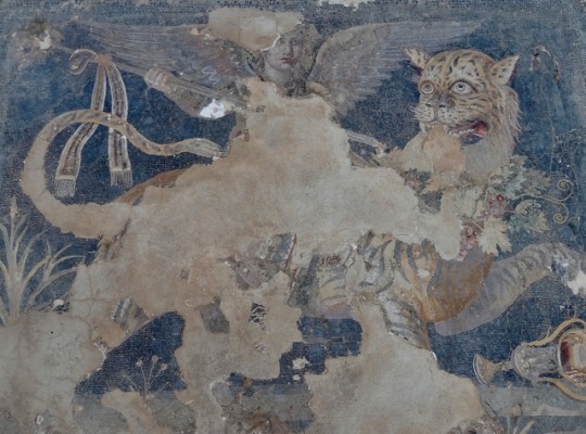 A Hellenistic Greek Mosaic depicting the god Dionysos as a winged daimon riding a tiger. From the House of Dionysos at Delos in Greece, late 2nd century BC.